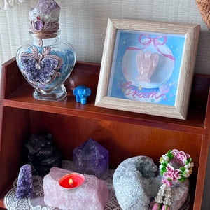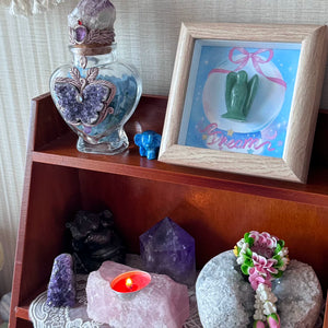 A framed crystal angel creates a “mini altar” feeling—calm, pretty, and easy to style. The frame makes it stable on a tabletop, while the crystal becomes the focal point.